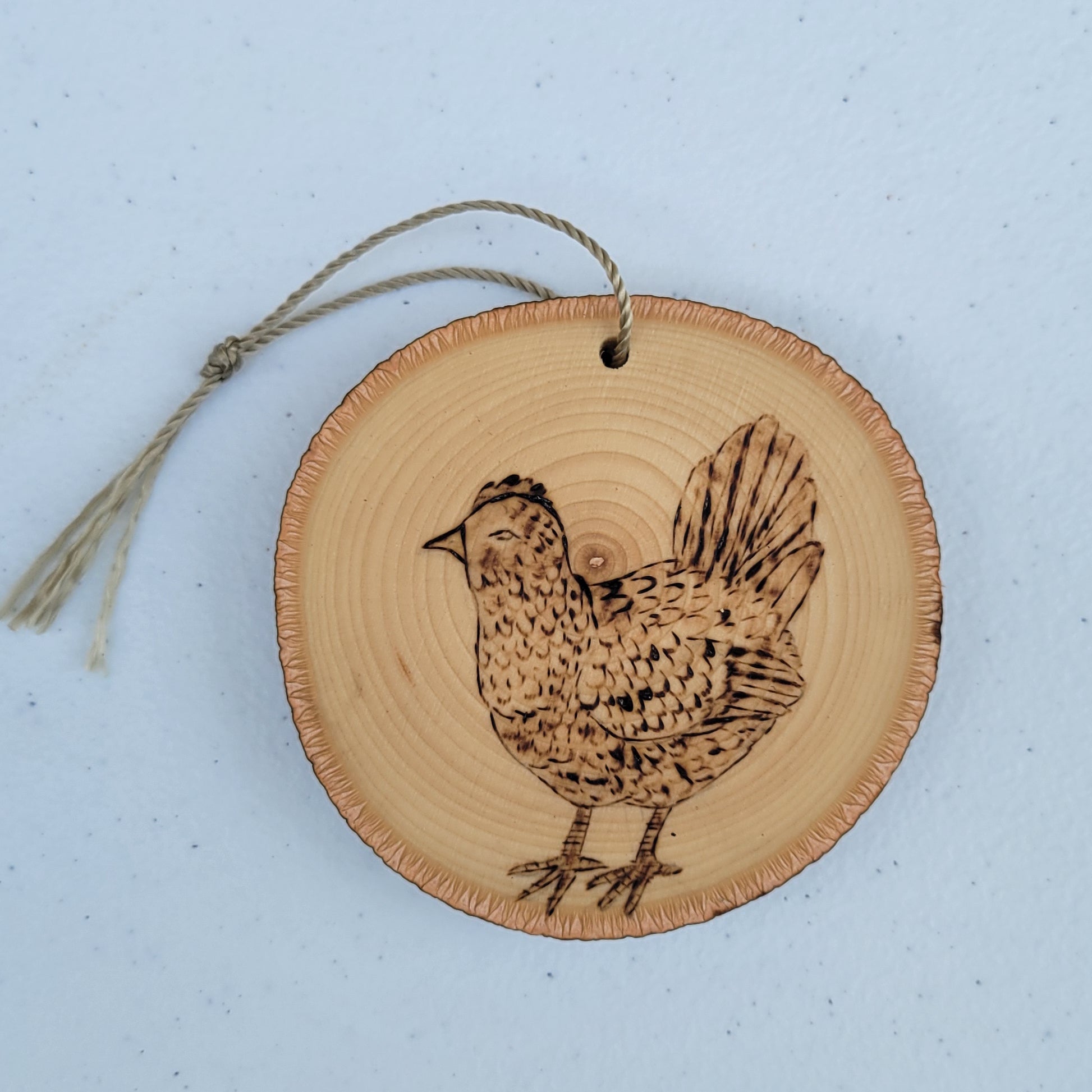 Handcarved woodcuts made by the Verlander Family. Medium woodcut round variations include chikadee, wren, gnome, and chicken.